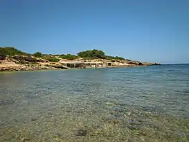 Es una playa de bolos y arena con alguna presencia de vegetación.