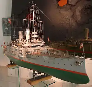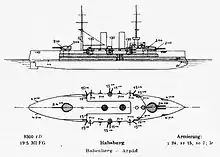• 3 cañones Krupp C97 de 240 mm/40 • 12 cañones Krupp C96 de 150 mm/40 • 10 cañones Skoda de 70 mm/45 • 6 cañones Skoda QF de 47 mm/44 • 2 cañones Skoda QF de 47 mm/33 2 tubos lanzatorpedos de 45 mm | |
