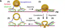 - Jahn R, Fasshauer D (2012). «Molecular machines governing exocytosis of synaptic vesicles». Nature 490 (7419): 201-7. PMID 23060190. doi:10.1038/nature11320.