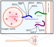 Hay ocho isotipos conocidos de BoNT, BoNT/A-H, que escinden las proteínas SNARE en diferentes sitios. Los isotipos A, C, y E actúan sobre la SNAP25 e impiden la formación del complejo SNARE. BoNT C también disocia la sintaxina, con efectos similares. Los isotipos B, D y F, a su vez, atacan a la sinaptobrevina en las neuronas sinápticas.[30] En todos estos casos, la neurotoxina botulínica impide la fusión de las vesículas sinápticas a la membrana sináptica y la liberación de los neurotransmisores en la hendidura sináptica. Esto impide de propagación de los impulsos que estimulan las células musculares, causando parálisis y, en casos graves, la muerte. Aunque los efectos de la neurotoxina botulínica pueden ser letales, también se ha utilizado como agente terapéutico en algunos tratamientos médicos y cosméticos.[35][36]