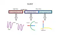 La toxina tetánica o TeNT se compone de una cadena pesada (100 kDa) y una cadena ligera (50 kDa) unidas por un enlace disulfuro. La cadena pesada es responsable de la unión neuroespecífica de TeNT a la membrana terminal nerviosa, la endocitosis de la toxina, y la translocación de la cadena ligera en el citosol celular. La cadena ligera tiene una actividad endopeptidasa dependiente de cinc o metaloproteinasa matriz (MMP) responsable de la escisión de la sinaptobrevina.[37]