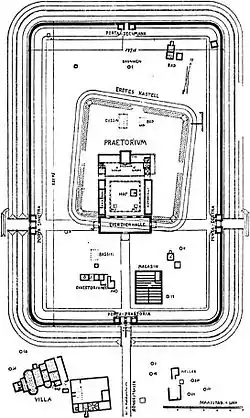 La praetentura contenía el praetorium o residencia del comandante de la unidad, al oeste de la via praetoria, y también un gran horreum o almacén de provisiones al este. El resto del campamento está hoy ocupado por un jardín con cespéd, pero en época romana debía albergar el resto de las dependencoas militares, como barracones subdivididos en contubernia -dos de estas casernas fueron reconstruidas-, establos, talleres y más almacenes.