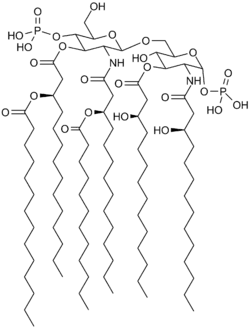 Estructura del lípido A de la bacteria Escherichia coli, formado por un disacárido unido a ácidos grasos.[1]