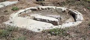 Los escasos restos arqueológicos recuperados entre 1899 y 1901 (una subestructura de travertino redonda, con borde de mármol, de 2,40 metros de diámtro) se ajustan bastante a las imágenes de las monedas.[6]