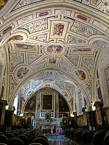 La bóveda de la nave central está dividida en tres cuadrantes, que muestran personificaciones de la Fe, la Religión y la Eternidad.[3] [4] A lo largo de las paredes hay un mobiliario del siglo XVII decorado con un ciclo de preciosas incrustaciones de madera de Fra Giovanni da Verona que data de 1506 (el tercer ciclo después de los de Santa Maria in Organo en Verona y la Abadía Territorial de Monte Oliveto Maggiore cerca de Asciano) con vistas de la ciudad y escenas de la vida en la orden olivetana. Entre las incrustaciones hay nichos con estatuas de madera que representan a santos relacionados con los olivetanos. Detrás del altar hay un cuadro de Carlo Borromeo, obra de Girolamo d'Arena, que había colgado en la iglesia original de Sant'Anna dei Lombardi (que también había sido dedicada a San Carlo Borromeo), pero que fue trasladado a su ubicación actual después de que esa iglesia fuera destruida en el terremoto de 1805. A ambos lados hay dos pinturas de Miguel Arcángel y la Virgen María.