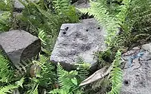 Los tres bloques que formaban la entrada, cada uno de unos 2 metros de largo y medio metro de circunferencia, y los bloques de la pared eran de granito porfirítico rojo, de dureza adamantina. Había otra puerta en la esquina sureste, que conducía al arroyo, en el que se encuentran varios bloques lisos y tallados de granito y arenisca. [15]