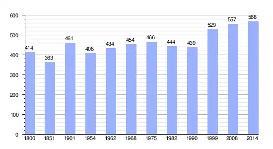 Los datos demográficos contemplados en este gráfico de la comuna de Saint-Aquilin-de-Pacy[4] se han cogido de 1800 a 1999 de la página francesa EHESS/Cassini, y los demás datos de la página del INSEE.[5]