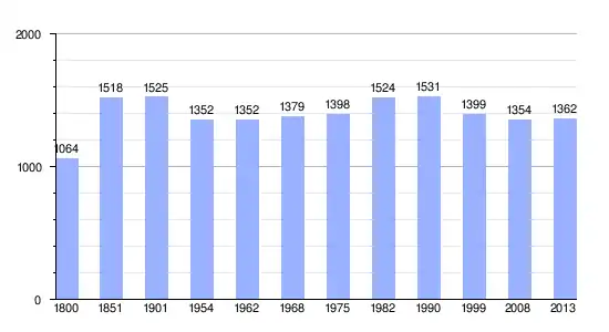 Gráfica de evolución demográfica de Saint-Aulaye entre 1800 y 2013 |