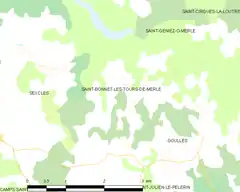 Saint-Bonnet-les-Tours-de-Merle (en occitano Sent Bonet[3]) es una comuna y población de Francia, en la región de Lemosín, departamento de Corrèze, en el distrito de Tulle y cantón de Mercoeur.