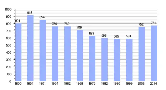 Los datos demográficos contemplados en este gráfico de la comuna de Saint-Georges-sur-Layon[4] se han cogido de 1800 a 1999 de la página francesa EHESS/Cassini, y los demás datos de la página del INSEE.[5]