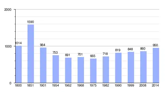 Los datos demográficos contemplados en este gráfico de la comuna de Saint-Germain-du-Crioult[4] se han cogido de 1800 a 1999 de la página francesa EHESS/Cassini, y los demás datos de la página del INSEE.[5]