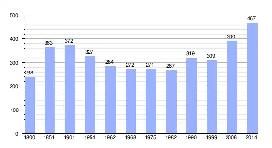 Los datos demográficos contemplados en este gráfico de la comuna de Saint-Germain-l'Aiguiller[4] se han cogido de 1800 a 1999 de la página francesa EHESS/Cassini, y los demás datos de la página del INSEE.[5]