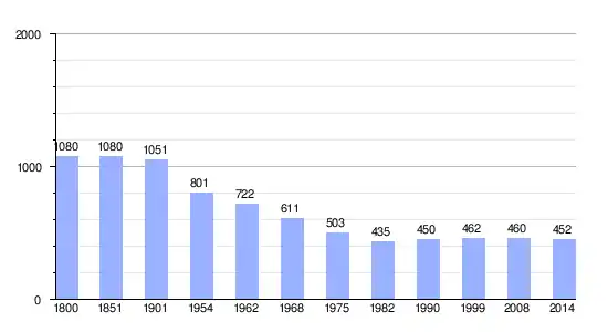 Los datos demográficos contemplados en este gráfico de la comuna de Saint-Guen[4] se han cogido de 1800 a 1999 de la página francesa EHESS/Cassini, y los demás datos de la página del INSEE.[5]