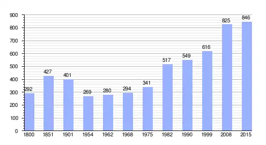 Los datos demográficos contemplados en este gráfico de la comuna de Saint-Jean-de-Touslas[4]se han cogido de 1800 a 1999 de la página francesa EHESS/Cassini, y los demás datos de la página del INSEE.[5]