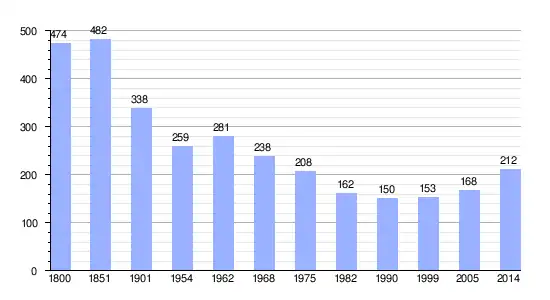 Los datos demográficos contemplados en este gráfico de la comuna de Saint-Jean-des-Essartiers[4] se han cogido de 1800 a 1999 de la página francesa EHESS/Cassini, y los demás datos de la página del INSEE.[5]