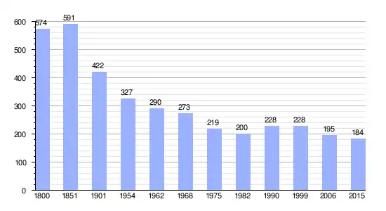Los datos demográficos contemplados en este gráfico de la comuna de Saint-Laurent-Lolmie[4]se han cogido de 1800 a 1999 de la página francesa EHESS/Cassini, y los demás datos de la página del INSEE.[5]
