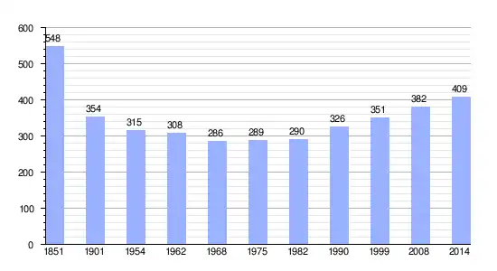 Los datos demográficos contemplados en este gráfico de la comuna de Saint-Laurent-de-Belzagot[4] se han cogido de 1851 a 1999 de la página francesa EHESS/Cassini, y los demás datos de la página del INSEE.[5]