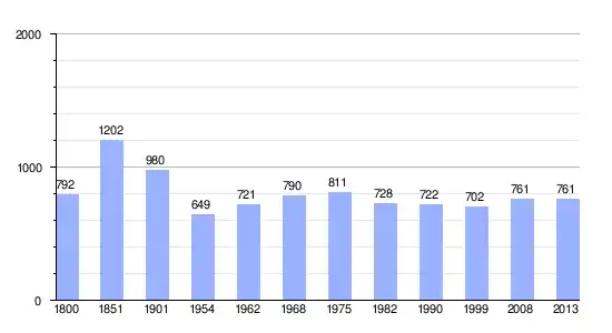 Los datos demográficos contemplados en este gráfico de la comuna de Saint-Laurent-du-Mottay[4] se han cogido de 1800 a 1999 de la página francesa EHESS/Cassini, y los demás datos de la página del INSEE.[5]