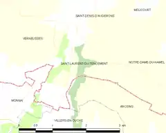 - Situación de Saint-Laurent-du-Tencement en un mapa de Francia y de comunas limítrofes (en francés)