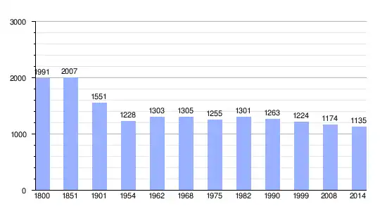 Los datos demográficos contemplados en este gráfico de la comuna de Saint-Martin-de-Landelles[4] se han cogido de 1800 a 1999 de la página francesa EHESS/Cassini, y los demás datos de la página del INSEE.[5]
