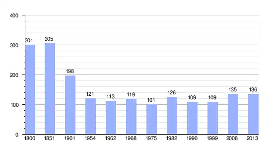 Los datos demográficos contemplados en este gráfico de la comuna de Saint-Maurice-de-Tavernole[4] se han cogido de 1800 a 1999 de la página francesa EHESS/Cassini, y los demás datos de la página del INSEE.[5]