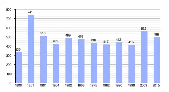 Los datos demográficos contemplados en este gráfico de la comuna de Saint-Maurice-lès-Charencey[4]se han cogido de 1800 a 1999 de la página francesa EHESS/Cassini, y los demás datos de la página del INSEE.[5]