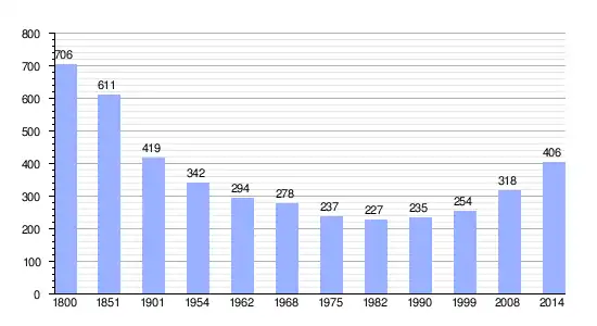 Los datos demográficos contemplados en este gráfico de la comuna de Saint-Ouen-des-Besaces[4] se han cogido de 1800 a 1999 de la página francesa EHESS/Cassini, y los demás datos de la página del INSEE.[5]