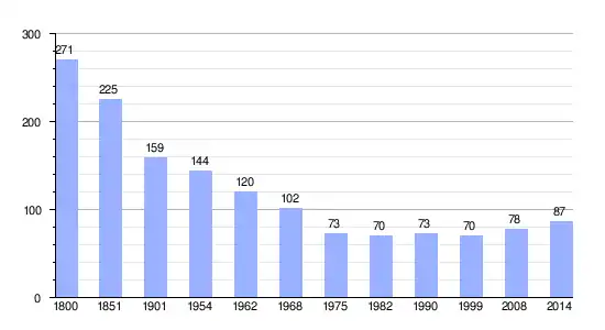Los datos demográficos contemplados en este gráfico de la comuna de Saint-Ouen-le-Houx[4] se han cogido de 1800 a 1999 de la página francesa EHESS/Cassini, y los demás datos de la página del INSEE.[5]
