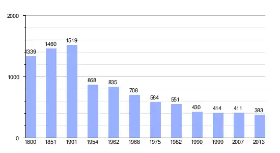 Los datos demográficos contemplados en este gráfico de la comuna de Saint-Privat-d'Allier[4] se han cogido de 1800 a 1999 de la página francesa EHESS/Cassini, y los demás datos de la página del INSEE.[5]