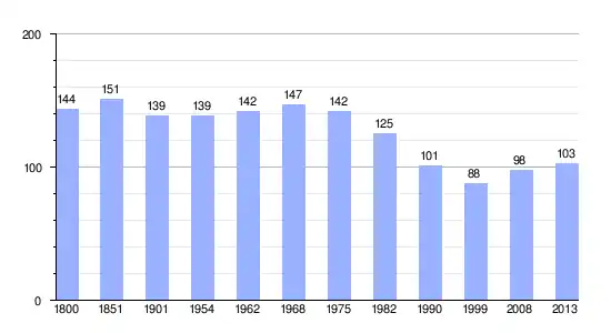 Los datos demográficos contemplados en este gráfico de la comuna de Saint-Quentin-au-Bosc[4] se han cogido de 1800 a 1999 de la página francesa EHESS/Cassini, y los demás datos de la página del INSEE.[5]