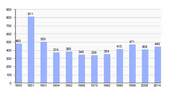 Los datos demográficos contemplados en este gráfico de la comuna de Saint-Rigomer-des-Bois[4] se han cogido de 1800 a 1999 de la página francesa EHESS/Cassini, y los demás datos de la página del INSEE.[5]