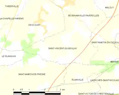 - Situación de Saint-Vincent-du-Boulay en un mapa de Francia y de comunas limítrofes (en francés)