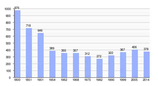 Los datos demográficos contemplados en este gráfico de la comuna de Sainte-Marguerite-de-Viette[4] se han cogido de 1800 a 1999 de la página francesa EHESS/Cassini, y los demás datos de la página del INSEE.[5]