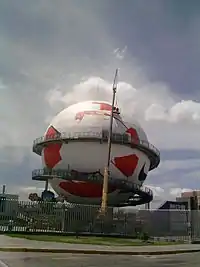 El edificio se terminó de construir el 9 de junio de 2011, por el arquitecto Ricardo Calderón Zorrilla, empleándose concreto reforzado.[2] El edificio tiene forma de esfera que emula un enorme balón de fútbol.[2] Cuenta con una altura de 38 m de altura y 36 m de diámetro; cuenta con tres niveles y 120 escalones.[2]
