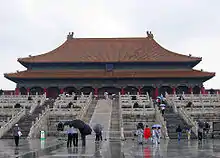 El Salón de la Armonía Suprema se eleva unos 30 metros sobre el nivel de la plaza y los alrededores. Es el centro ceremonial del poder imperial y la mayor estructura de madera que se conserva en China. Son las nueve bahías de ancho y cinco tramos, los números nueve y cinco simbólicamente conectada a la majestad del emperador. Los seis pilares más cercanos al trono imperial están cubiertos de oro y toda la zona está decorada con un motivo de dragón. El Trono Imperial Dragón, en particular, tiene cinco dragones enrollados alrededor de la espalda y apoyamanos. La pantalla detrás de él cuenta con series de nueve dragones, que refleja nuevamente el simbolismo "nueve-cinco".