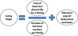 es el pago mínimo necesario a un trabajador para que satisfaga sus necesidades básicas. Estas necesidades incluyen alimento, alojamiento, y otras como ropa. En español también se designa este concepto con las expresiones salario digno, salario justo (fair wage), sueldo decente, sueldo digno, sueldo justo, salario vital, salario para vivirEl objetivo de un salario decente es proporcionar al trabajador un nivel de vida básico, pero decente. Debido a la naturaleza flexible del término "necesidades", no hay una medida universalmente aceptada de qué es un salario decente, porque varía con el lugar geográfico y el tipo de hogar.[5][6][7]