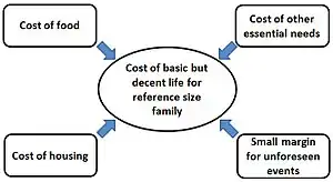 Un salario decente, en algunos países como el Reino Unido y Nueva Zelanda, generalmente significa que una persona que lo cobra por trabajar 40 horas a la a semana, sin ingresos adicionales, tendría que ser capaz de pagarse con él lo básico para una vida modesta, pero decente, como comida, alojamiento, suministros (agua, electricidad, gas, teléfono), transporte, salud y cuidado de los hijos.[8][9][10]
