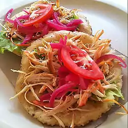 Consiste en una tortilla de maíz frita en aceite o manteca de cerdo (preferentemente), de manera que queda un poco inflada y suave, servida con lechuga, tomate, cebolla curtida, carne de pavo o pollo deshebrado y aguacate.[2] Se suele servir con salsa picante hecha a base de chile habanero. También puede rellenarse con otros guisos de la gastronomía yucateca como la cochinita pibil, relleno negro o pollo en escabeche.