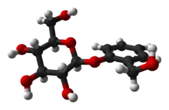 La salicina es un glucósido β- alcohólico. La salicina se produce en (y se llama así) la corteza del sauce (Salix) y actúa como un agente antiinflamatorio en el cuerpo humano.[3] También se encuentra en el castóreo, que se usó como analgésico, antiinflamatorio, y antipirético. La actividad del castóreo se ha acreditado por la acumulación de salicina de los sauces en la dieta del castor que se transforma en ácido salicílico y tiene una acción muy similar a la aspirina.[4]
