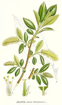 - Esta obra contiene una traducción derivada de «Salix pentandra» de Wikipedia en inglés, publicada por sus editores bajo la Licencia de documentación libre de GNU y la Licencia Creative Commons Atribución-CompartirIgual 3.0 Unported.