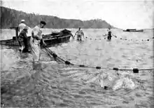 También se pescan salmones con una tela sencilla o sea red Salmonera. Se tiende al través del río para detener los peces que quieren subir y cuando se han juntado cerca de la red se pasa con un barco que con otra red pequeña forma una línea circular para rodearlos y sacarlos a tierra. Algunos pescadores se alejan con sus barcos a doscientas, trescientas o más brazas y vuelven batiendo el agua con varales para obligar a los peces a que se junten cerca de la red tendida al través del río. Esta pesca no se hace más que de día.