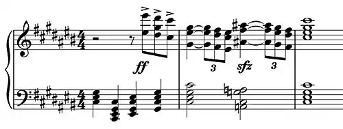 En la escena final de la ópera, después de que Salomé bese la cabeza cortada de Jokanaán, la música llega a un clímax dramático, que acaba con una cadencia implicando un acorde poco ortodoxo muy disonante en el compás 360 de la partitura. Este único acorde ha sido ampliamente comentado. Se ha llamado "el acorde más repugnante de toda la historia de la ópera", una "disonancia que hace época con la que Strauss lleva a Salomé... a lo más profundo de la degradación", y "la quintaesencia de la Decadencia: aquí el éxtasis cae sobre sí mismo, despedazándose hacia el abismo".[10] El acorde es politonal, con un la bajo7 (un acorde de séptima dominante) fundido con un acorde mayor más alto en fa sostenido. Forma parte de una cadencia en la tonalidad de do sostenido mayor y se acercan a él y se resuelve en acordes de do sostenido mayor. No sólo es el acorde horriblemente disonante, especialmente en su contexto musical y rica orquestación, tiene un significado más amplio debido en parte al cuidadoso uso que Strauss hace de las tonalidades y los leitmotifs para simbolizar los personajes de la ópera, emociones como el deseo, la lujuria, la repulsión y el horror, así como la fatalidad y la muerte. Se ha escrito mucho sobre este acorde en particular y su función dentro de la estructura formal a gran escala de toda la ópera.[11]