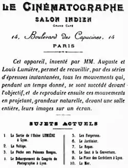 El Salon indien du Grand Café fue donde tuvo lugar la que corrientemente es aceptada como la primera proyección cinematográfica comercial, el 28 de diciembre de 1895 (otros afirman que la primera tuvo lugar el 1 de noviembre de ese año por Max Sklandausky en el Wintergarten de Berlín aunque dicha exhibición fue realizada con el Bioscope y dentro de un espectáculo de variedades de teatro).[1] La sala estaba situada en el N.º 14 del Bulevar de las Capuchinas, en el IX Distrito de París (Francia), donde se encuentra actualmente el Café Lumière del Hotel Scribe.