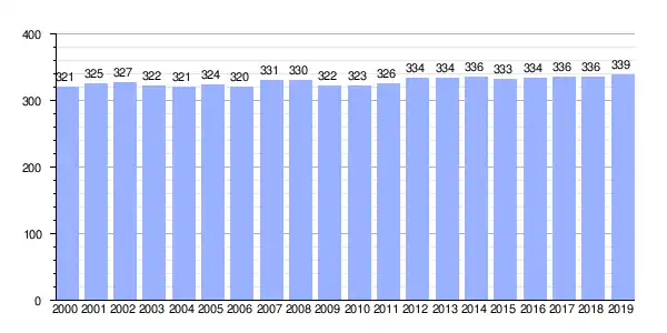 Gráfica de evolución demográfica de Salto entre 2000 y 2019 |