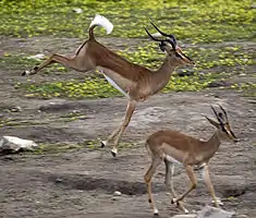 - Una buena forma de realizar un escape rápido o salvar obstáculos. Sin embargo, esto no se aplicaría en el caso de las gacelas de Thomson porque ellas no saltan de rebote cuando un depredador se encuentra a menos de unos 40 m de distancia.[3][8]