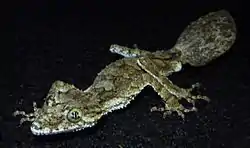 Mide entre 15 y 21 cm. Su camuflaje es sorprendente, haciéndole pasar inadvertido a la mayoría de los depredadores. Tiene un cuerpo moteado de gris y achatado. Su cola tiene la forma de una hoja y puede deshacerse de ella si resulta atacado. Vive en los troncos de los árboles y en el follaje de selvas tropicales. Se alimentan principalmente de noche, especialmente de insectos.Durante el día se camufla en los árboles. Su forma aplastada hace que proyecte poca sombra, y las púas de la piel desfiguran su perfil.[cita requerida]