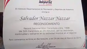 - Esto se confirma por el mismo Salvador Nasar Nazzar el su biografía del libroNazzar Nazzar, Salvador (15 de febrero de 2012). Historia del deporte en Colombia en el siglo XX figuras. Escuela de Postgrados de Policía "Miguel Antonio Lleras Pizarro": Editor: Barranquilla : [s.n.], 2008. ISBN 9789584436894. Archivado desde el original el 17 de noviembre de 2015. Consultado el 19 de diciembre de 2012.