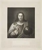 La pintura muestra a Cristo como rey y salvador del mundo; se representa de frente, sosteniendo una esfera transparente que simboliza la totalidad del cosmos, esto es, la esfera de las estrellas fijas que es lo máximo a lo que alcanza la vista humana. En otras versiones del cuadro, sostiene un globo terráqueo en lugar de la esfera. Con la otra mano, hace el gesto de la bendición latina.