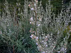 Es un subarbusto que puede crecer más de 1 metro de altura. Las hojas (aproximadamente de 4-8 cm de largo) se encuentran en la base y están cubiertas de pelos densos que les dan una coloración blanca. Las hojas son lanceadas con bases muy estrechas, y los márgenes son dentados. La inflorescencia es un cúmulo con pocas flores. Las flores de color blanco tienen manchas y vetas de color lavanda. Las flores tienen una forma bilateral y tienen 12-22 mm de longitud. Tanto los estambre como los estilos salen más allá del final de los lóbulos de la flor.