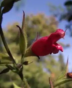 En los jardines de California, alcanza 2,4 metros de alto y 1,2 m de ancho, y en la naturaleza que alcanza hasta 3,7 m. Las flores se inflan y tienen dos labios, que varían en color desde rojo ladrillo, rosa-rojo, el escarlata, y se encuentra hasta 15 en racimos. El cáliz es de un llamativo color rojo oscuro, alrededor de 1,3 cm de largo. Los tallos y peciolos de las hojas tienen pelos cortos lanosos, haciendo que aparezcan grises. Las hojas son ásperas y perennes, con vetas en la parte inferior y con pelos de color crema.[1]